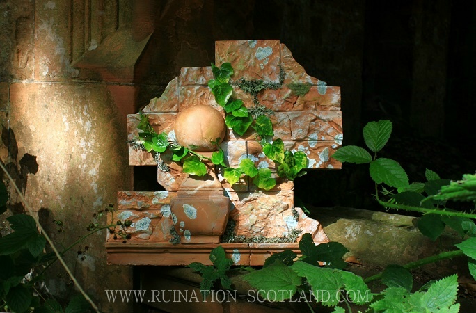 Pinnacle and blocks cast in a mixture of plaster and sand, mounted on hardboard. Coloured with paint and chalk pastel. Finished with real ivy, moss and lichen.