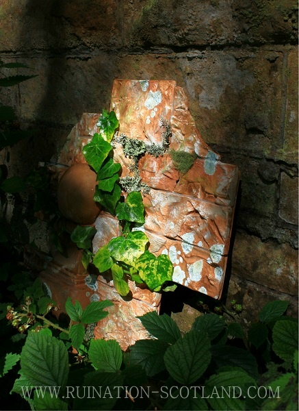 Pinnacle and blocks cast in a mixture of plaster and sand, mounted on hardboard. Coloured with paint and chalk pastel. Finished with real ivy, moss and lichen.