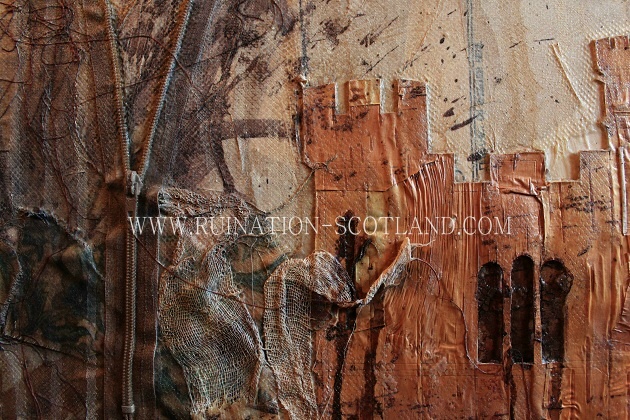 Birch bark, fabric collage, ink, tea and paint.